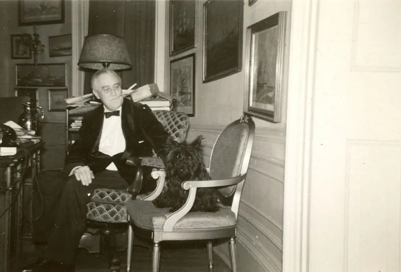 FDR also had a number of dogs during his presidency, two of the most notable being Scottish Terriers Fala and Meggie. In the photo above, Fala keeps FDR company just 13 days after the attack on Pearl Harbor. Other Roosevelt dogs include: Winks (Llewellyn Setter), Tiny (Old English Sheepdog), President (Great Dane), and Blaze (Bullmastiff).