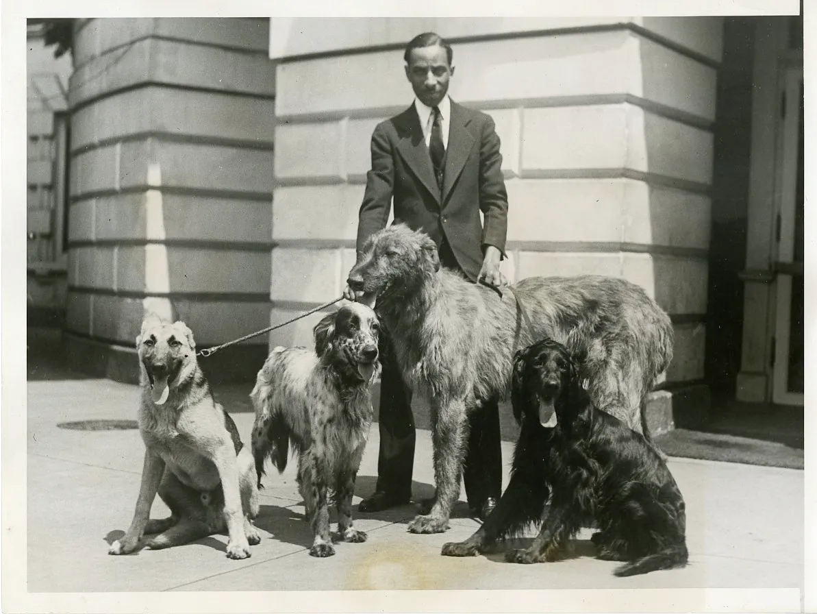 Herbert Hoover had several dogs, two of the most famous being King Tut, a Belgian Malinois, and Weegie, a Norwegian Elkhound. Other White House dogs during Hoover’s presidency include Pat (German Shepherd and former German police dog), Marks (English Setter), Patrick (English Wolfhound), and Inglehurst Gillette (Gordon Setter). Hoover even had a dog master named Harry Waters, pictured below with some of the dogs.