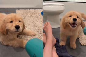 The now-viral video opens with Bruce’s mom opening the door to the backyard. She is wearing a cozy sweater, confirming it is cold outside. It is pouring, but there stands Bruce in the rain, standing on his stick. The camera stays on the Golden as the rain pours harder.