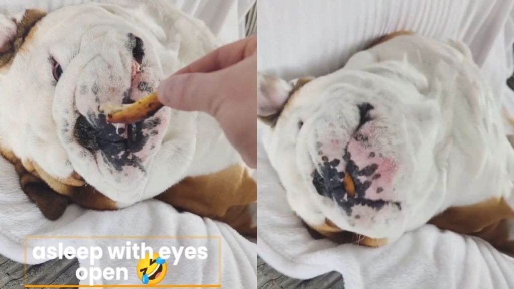 The dog dad made sure to share his pup’s talent with the world on @bulldogpabs. The clip shows the pet parent carrying a small piece of snack between his fingers and going to his Bulldog, who is “asleep with eyes open” on the couch.