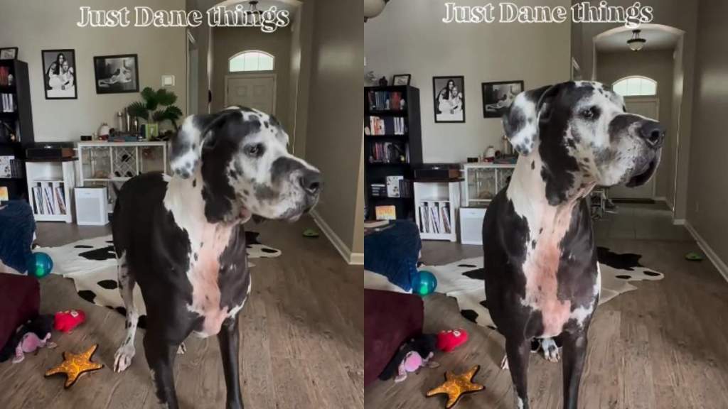 When the second Great Dane doesn’t get any response from his friend, she approaches her owner. It seems like she whines to the pet parent, who tries to comfort her while teasing her. The human laughs and pulls Pepa’s leg by accusing her of being “jealous” of Appa.