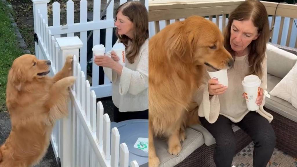 The adorable video starts with the dog spotting his grandma through the fence, with the onscreen text reading, “Grandma’s here.” That’s all it takes for the Golden Retriever to launch into full celebration mode. He tears down the porch steps and barrels across the yard toward her, while she is standing on the other side of the fence holding two coffee cups.