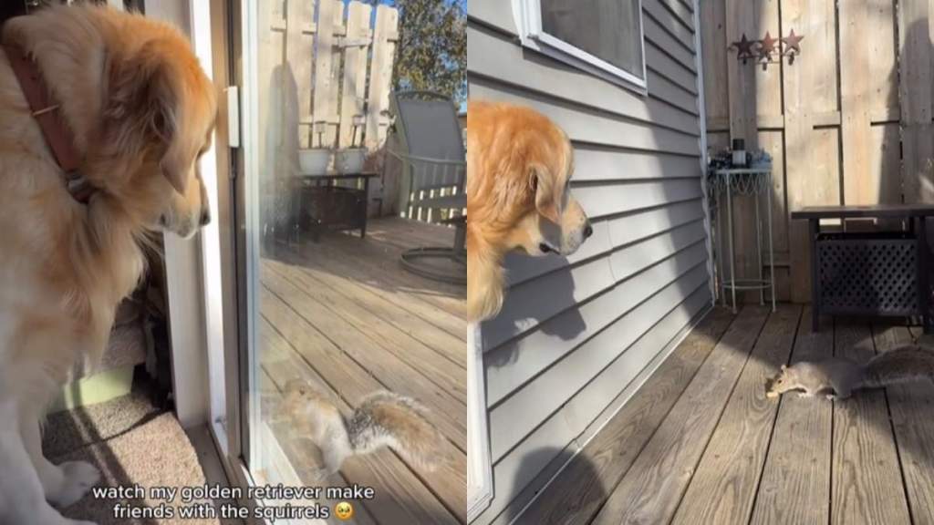 Owner records Golden Retriever’s interaction with squirrels in video