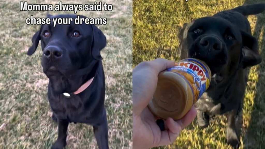 Video shows dog chasing after a peanut butter jar like it’s his dream