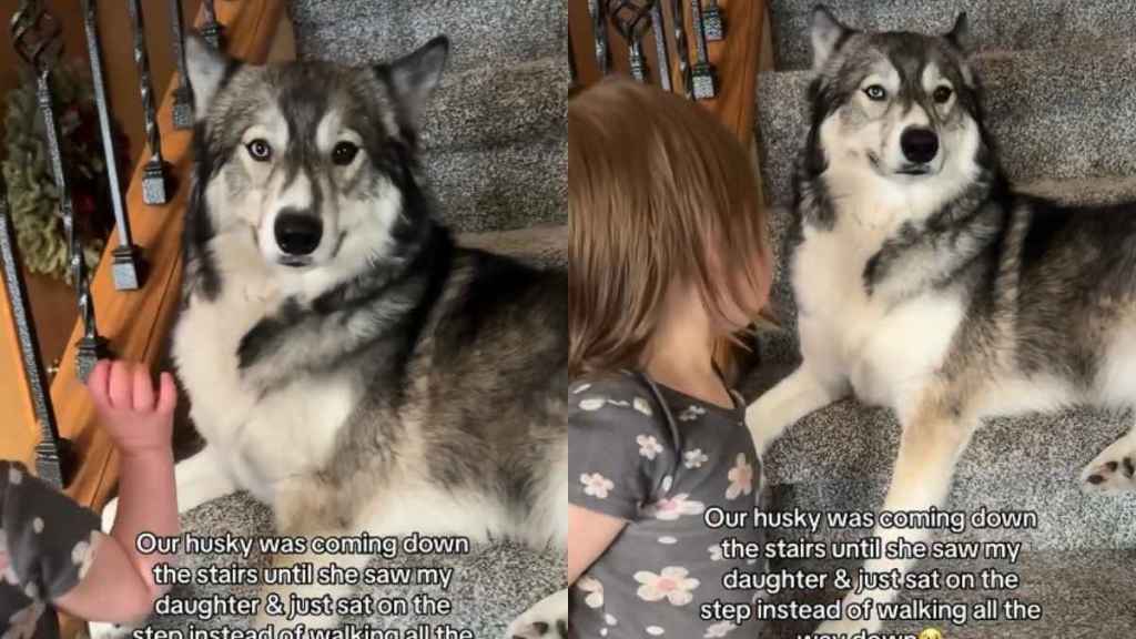 A sweet video going viral online shows a dog slowing down and being gentle after noticing a kid halfway down the stairs, and viewers can’t stop watching it. The onscreen text explains: “Our husky was coming down the stairs until she saw my daughter and just sat on the step instead of walking all the way down.”