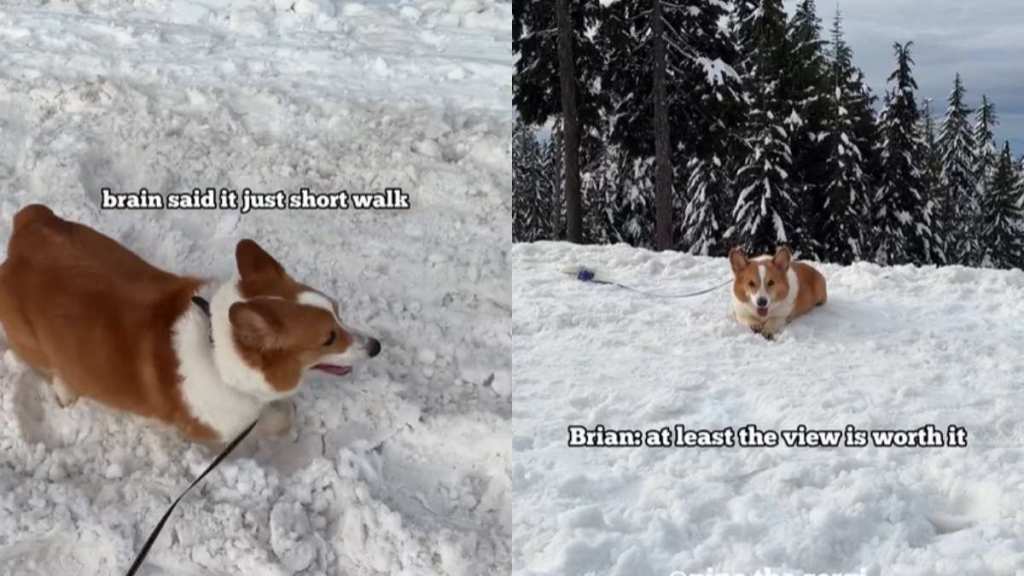 The video on @pino.the.corgi shows him out at Dog Mountain, BC, trying his best to navigate a snowy hike, but in reality, fighting gravity with four-inch legs is an impossible task. His human — who he calls “Brain” — promised him an easy loop. Spoiler alert: it wasn’t easy. This video is a total mood for anyone who’s ever been lured outside under false pretenses of “fun.”