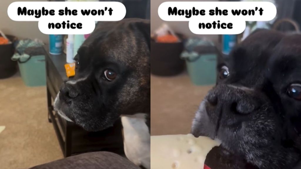In a hilarious dog video on Instagram, a Boxer named Teddy tries his best to steal cheese from his owner’s plate. It displays a text onscreen, featuring the pet’s inner thoughts: “Maybe she won’t notice.” It looks like the furbaby wants to sneakily pull the food item away and attempts to complete the heist flawlessly without being caught.