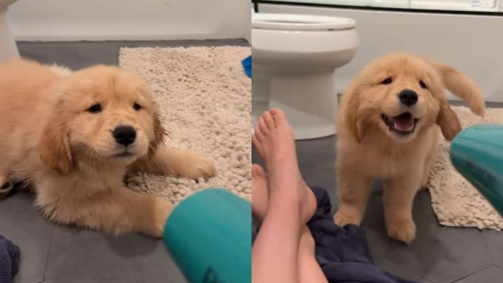 The video, shared four days ago, follows Frankie, a Golden Retriever puppy, as she faces the blow dryer again. At first, she sprints away when the dryer turns on. However, the next scene jumps to a bathroom moment, where she stays put and seems curious.