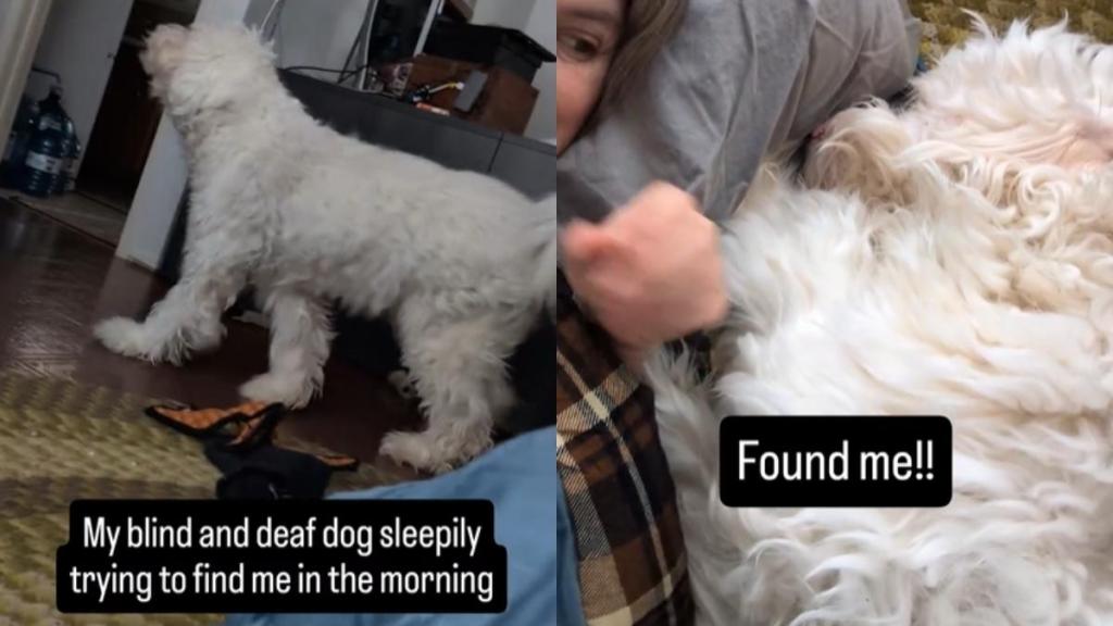 Waking up and realizing your mom isn’t in her usual spot on the bed is a bit confusing when you can’t see or hear where she went. Because she was sleeping in the living room, Bumper woke up to a very empty room. This pup is blind and deaf, so he has to put his nose to work to figure out the situation. Over at @bumpertheluckdragon, this video shows this double merle dog sleepily wandering through the house, hoping to find his person — his mom.