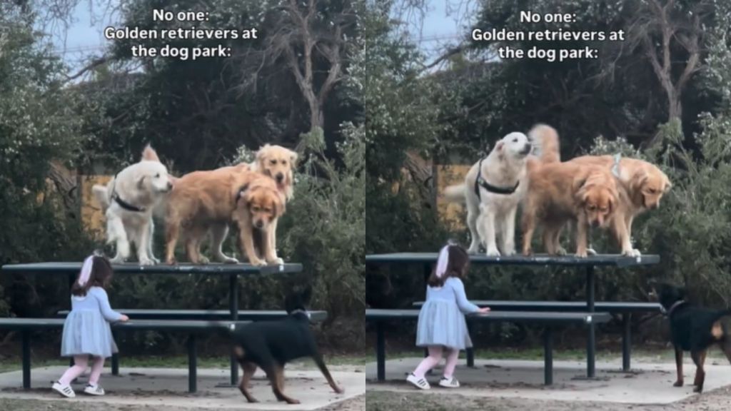 The clip captures a pack of Goldens turning a dog park visit into their own show. On the screen, the creator notes what “Golden retrievers at the dog park” are like, as three of them charge straight past the open field and leap onto a picnic table.