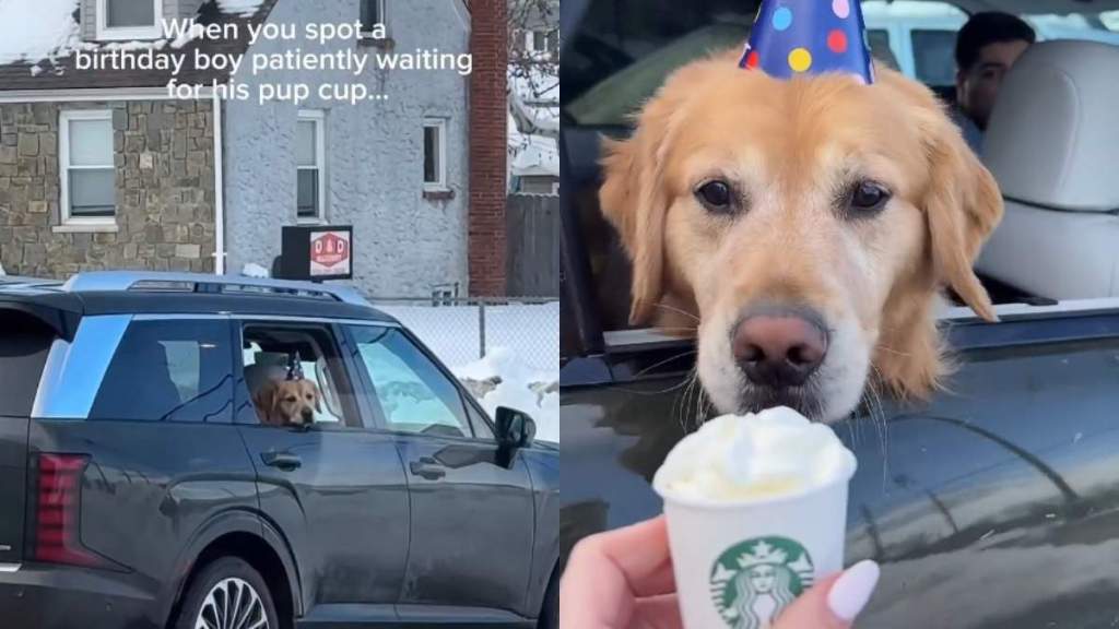 It is Beau’s 5th birthday, and he is sitting in the back seat wearing a blue birthday hat with colorful polka dots. In this dog video, the Golden Retriever is waiting for his birthday pup cup to arrive, and he is doing it with more patience than most people have in a coffee line.
