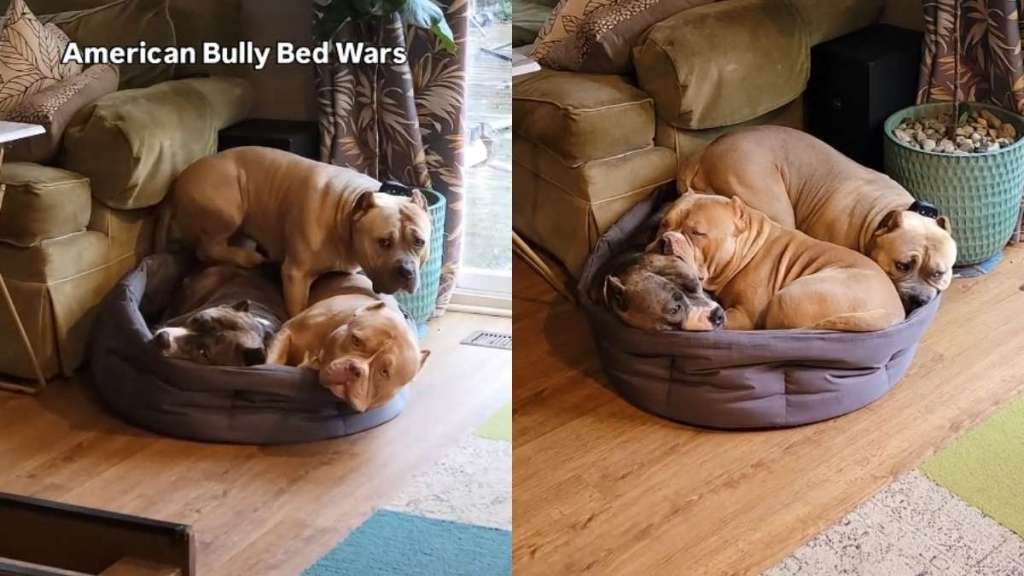 This video perfectly captures the chaos and cuteness of four American Bully dogs trying to claim a spot in bed. The owner narrated the entire incident, explaining that the pups love to squish together, even when it’s uncomfortable. She also mentioned that the battle to claim the spot is something usually seen at their home. The video shows all four dogs trying to take each other’s spots for a quick nap.