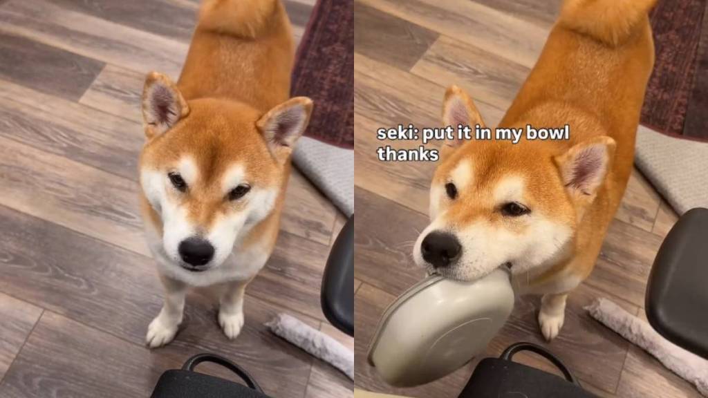 Shiba Inu brings and drops bowl in front of owner to declare motto ‘sharing is caring’