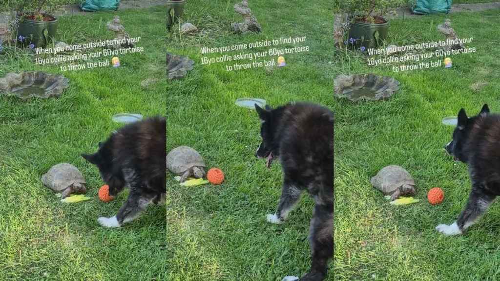 The text on the video reads, “When you come outside to find your 16yo collie asking your 60yo tortoise to throw the ball,” capturing the humor of the situation. The owner also added a lighthearted remark, saying they sometimes wonder what it would be like to have “normal pets.”